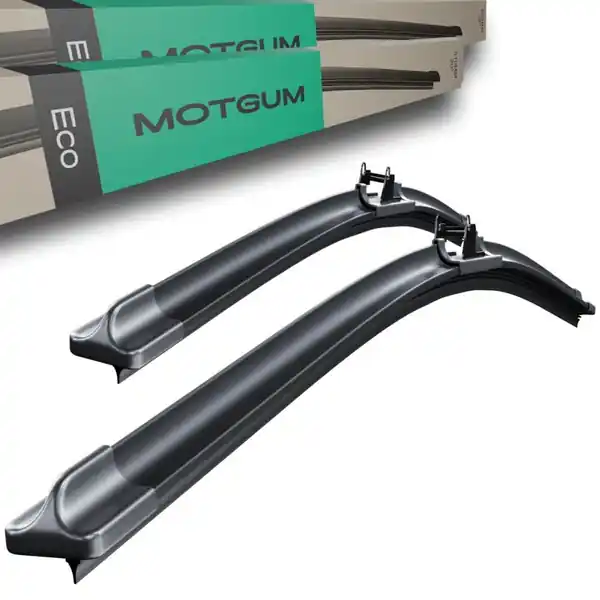- Płaskie pióra wycieraczek z ekonomicznej serii ECO marki Motgum posiadają gumowy wkład, który montowany jest bezpośrednio wewnątrz sprężystych listew pióra z pominięciem metalowej oprawy, co wraz z odpowiednio dopasowaną formą pióra skutkuje zmniejszonym oporem powietrza.