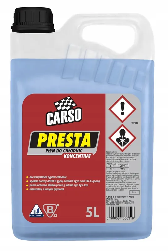 Płyn do chłodnic Presta to wysokiej jakości koncentrat stworzony z myślą o zapewnieniu optymalnej ochrony układu chłodzenia Twojego pojazdu. Jego innowacyjna formuła gwarantuje efektywne odprowadzanie ciepła, co przekłada się na lepszą wydajność silnika i dłuższą żywotność komponentów.