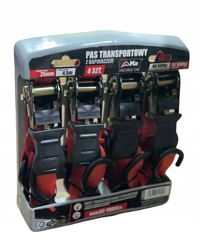 Pasy transportowe firmy K2 posiadają łatwy, szybki i bezpieczny system wiązania. Doskonale sprawdzają się do wszelkiego rodzaju transportu. Pas wykonany jest z taśmy poliestrowej o podwyższonej wytrzymałości dzięki czemu jest bardzo wytrzymały.Można je stosować do mocowania ładunków na samochodach, przypasanie rowerów, motorów quadów na lawecie, mocowanie mebli, pudeł podczas transportu itp. Właściwości produktu: Maksymalne obciążenie WL (kg) 500 Siła zrywająca BS (kg) 1000 Szerokość (mm) 25 Długość (m) 4,5