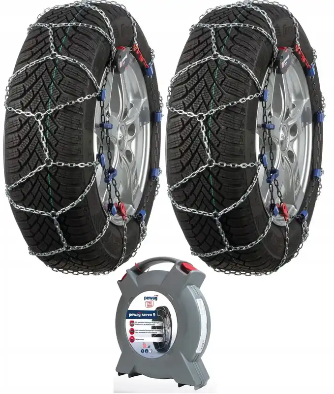 - Diamentowy (rombowy) wzór łańcuchów śniegowych zapobiega poślizgom bocznym.