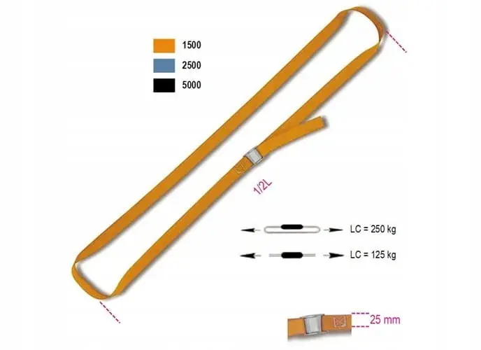- Specyfikacje techniczne: Pas spełnia wymagania standardów LC=2500daN, SHF=50daN i STF=300daN.