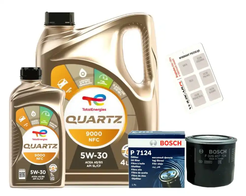 - Olej 5W30 Total Quartz 9000 NFC (4L + 1 x 1L) (potrzebujesz 4.1-5.8 litra oleju )- to olej silnikowy o zaawansowanejtechnologii syntetycznej, który został opracowany wcelu spełnienia najbardziejrygorystycznych wymagań zarówno silników benzynowych jak iwysokoprężnych. Znacznie przekracza wymagania następujących normmiędzynarodowych: ACEA:C3